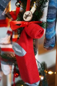 Schritt 4: Wenn die Deko soweit fertig ist, befülle nun die Socken und verschließe sie mit einem Band. Das eine Ende der Schleife sollte länger sein, damit es danach aufgehängt werden kann. TIPP: damit die Schleife nicht aufgeht, mache eine Doppelschleife.